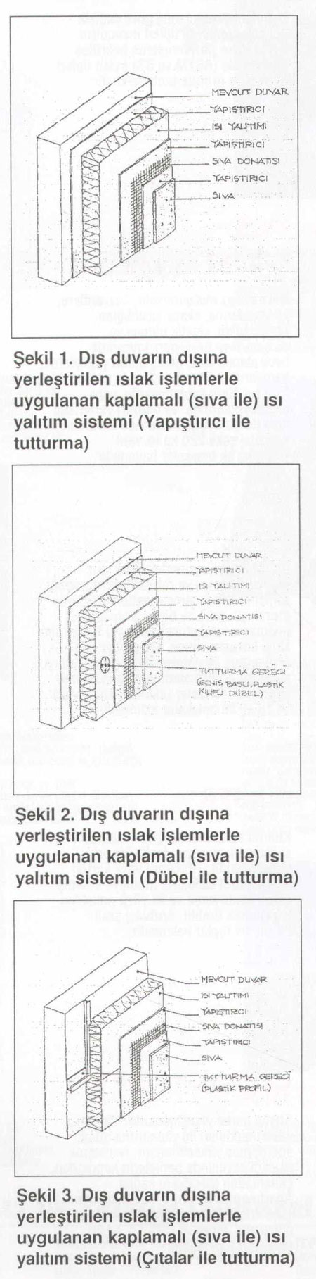 Bina dış kabuğunun önemli bir parçası olan dış duvarın opak bileşeninde bu amaca yönelik olarak, dıştan farklı tipte ısı yalıtım sistemlerinin uygulanması olanaklıdır. Tasarımın karar verme aşamasında, uygun sistem çözümlerinin belirlenmesinde veya var olan binaların değerlendirilmesinde, sistemler ile ilgili performans gereksinmelerinin bilinmesi gereklidir. Çalışmada, dış duvarların dışına yerleştirilen ıslak işlemlerle uygulanan kaplamalı (sıva ile) ısı yalıtım sistemi örneği üzerinde, sistem bileşenleri, kullanılabilecek malzemeler ve işlevleri tanıtılmış ve sistemin bir bütün olarak; ısıl, sunem ile ilgili, yangın ile ilgili, ses ile ilgili, stabilite ile ilgili, kullanım ile ilgili performans gereksinmeleri analiz edilerek ortaya koyulmuştur. Giriş Günümüzde binaların enerji etkinliğinin, enerji kullanımının istenilen düzeyde tutularak, kullanıcıların enerji için yaptıkları harcamaların düşürülmesi, ülke ekonomisine katkı ve çevre kirliliğinin azaltılması açılarından taşıdığı önem bilinmektedir. Binaların enerji etkinliğinin sağlanması ise enerji kazançlarının denetlenmesi, enerji kayıplarının denetlenmesi ve enerji kullanımının denetlenmesi yöntemleri ile gerçekleştirilebilmektedir. Dış kabuğun opak bileşeninde ısı şeklindeki enerji kayıp ve kazançlarının denetlenmesi kabuğun, ısı geçirme, ısı depolama gibi ısıl ve yutuculuk ve yansıtıcılık gibi opak özellikleri yardımı ile olabilmektedir. Bunlar arasında en etkili özellik olan ısı geçirme özelliği, kabuğu oluşturan katmanların ısı iletkenlik katsayıları ile kalınlıklarına bağlıdır. Kabuğun, gövdesinin ve kaplamalarının ısı geçirme özelliğinin istenilen düzeyde olmaması durumunda, bir ısı yalıtım katmanı eklenerek, istenilen özelliklerin kazandırılması olanaklıdır. Isı yalıtım katmanı, kabuğun içine, ortasına veya dışına yerleştirilebilmektedır. Isı yalıtım katmanının kabuğun dış tarafına yerleştirilmesi, özellikle iskelet yapı sisteminde oluşabilecek ısı köprülerinin engellenmesi açısından diğer seçeneklere göre daha uygundur. Isı yalıtım katmanının kabuğun dışına yerleştirilmesinde farklı malzemelerden oluşan bileşenlere sahip, farklı yöntemler ile uygulanan ısı yalıtım sistemlerin kullanılması olanaklıdır. Uygulanacak ısı yalıtım sistemin birici işlevi, ısı kayıp ve kazaçlarının denetlenmesine yönelik olarak, bir ısıl direnç oluşturmak ve bununla birlikte, özellikle dıştan uygulanan sistemlerin, dış kabuğun opak bileşeninden genel olarak beklenilen işlevlerin de büyük bir bölümünü yerine getirmesi gerekliliği ortaya çıkmaktadır. Bunun yanı sıra ısı yalıtım sisteminin birincil işlevinin de sürekliliğinin sağlanması gereklidir. Farklı özelliklere sahip dıştan uygulanan ısı yalıtım sistemlerinin, uygulama sonrası kendilerinden beklenilen işlevleri yerine getirememeleri ile ilgili sorunların ortaya çıkmaması için, tasarım aşamasında, sistem seçeneklerinin değerlendirilerek, en uygun olanının seçilmesi gerekmektedir. Performans yaklaşımı ile sistemlerin değerlendirilerek, seçimi, çevresel etmenler ve kullanıcı gereksinmelerine bağlı olarak performans analizi yapılması, performans gereksinmelerinin ortaya koyulması, performans değerlendirme ölçütlerinin oelirlenmesi, performans değer'endirme ölçütlerinin sınır değerlerinin belirlenmesi, performans değerlendirmesi ve buna bağlı olarak seçimin yapılması aşamadan oluşmaktadır [1]. Asağıda, ıslak işlemlerle uygulaman kaplamalı (sıva ile) ısı yalıtım sistemi örneği üzerinde, sistem tipleri ve sistem bileşenleri tanıtılmış, sistem ile ilgili performans gereksinmeleri, Avrupa [2],[3] ve Amerika'da [4] konu ile ilgili olarak yapılmış çalışmalar da esas alınarak ortaya koyulmuştur. Sistem tipleri Islak işlemlerle uygulanan kaplamalı (sıva ile) ısı yalıtım sistemi farklı yöntemler ile duvar gövdesine tutturulabilmektedir. Duvar gövdesinin özelliklerine ve rüzgarın emme kuvvetinin etkinliğine bağlı olarak, sistemin yapıştırılarak (Şekil 1) dübelli vida, çivi (Şekil 2) veya çıtalar (Şekil 3) ile uyguanması olanaklıdır. Sistem bileşenleri: İşlevleri ve «jllanılabilecek malzemeler Dış duvarın dışına yerleştirilen ıslak işlemlerle uygulanan kaplamalı (sıva ile) ısı yalıtım sistemi; ısı yalıtimi, sıva donatısı, yapıştırıcı, tutturma gereçleri, sıva ve diğer bazı aksesuar gereçlerinden oluşmaktadır. Bu bileşenlerin sistem içerisinde üstlendikleri işlevler bu işlevlerin yerine getirilmesine olanak tanıyan bazı malzeme seçenekleri aşağıda sıralanmıştır. Isı yalıtımı: fabrikada üretilmiş, yeterli ısıl dirence sahip levhalardır. Duvardan meydana gelen ısı geçişinin istenilen düzeyde tutulması işlevini üstlenmektedir. Isı yalıtimi olarak; doğal lifli (cam yünü, taş yünü gibi) veya yapay köpük (eps, xps gibi) levhalar kullanılabilmektedir. Sıva donatısı: Isı yalıtımı katmanı üzerine yapılan ıslak uygulamalı kaplamanın, yani sıvanın içine yerleşirilerek, bunun mekanik dayanımını artırma işlevini üstlenmektedir. Sıva donatısı olarak; cam lifi, metal veya plastik fileler kullanılabilmektedir. Yapıştırıcı: Isı yalıtımının dış duvara, sıva donatısının ısı yalıtımına, köşe profilinin ısı yalıtımına tutturulmasında kullanılmaktadır. Aşağıda sıralanan üç farklı tipte yapıştırıcının kullanılması olanaklıdır: ? Toz halinde olup, inorganik ve/veya organik bağlayıcılı ve örneğin su gibi katkılar ile karıştırılarak hazırlanan ? Harç kıvamında olup, herhangi bir katkı gerektirmeden karıştırılıp uygulanabilen ? Harç kıvamında olup, örneğin çimento 