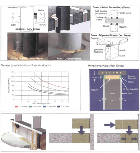 Pasif Yangın Koruma istemlerinin Tanımı Pasif yangın durdurucu malzemeler yapı elemanlarına ısısal enerji transferini geciktiren geçişini yavaşlatan koruma malzemeleridir. Bir başka deyişle; "Bir yapının pasif yangın koruması yapıdaki sıcaklık yükselmelerine karşı ve/veya yapının yangınla karşılaşmayacak tarafında maksimum müsaade edilebilir sıcaklıktan daha düşük bir sıcaklık oluşacak şekilde izole etmektir." diye tanımlanabilir. Ayrıca; pasif yangın durdurucu malzemeler, yapının taşıyıcı sistemlerinin (betonarme, çelik, ahşap) stabilitelerini ve mukavemetlerini koruyarak, yapının sökme olasılığını azaltırlar. Pasif yangın koruma sistemleri bir binada yangın güvenliğini ve yapısal yangın korunumunu sağlar. Silikat bazlı mastikler Servis sıcaklığı () 40 , () 100 "C'dir Türkiye Yangından Korunma Yönetmeligindeki Derzler, Boşluklar ve Geçişler Madde 25Düşey iç bölmeler ve bitişik nizam yapıların yangın duvarları yangına en az 90 dakika dayanıklı olarak projelenmelidir. Bölme aralıkları 60 metreyi aşmamalıdır. Bölmelerde delik ve boşluk bulunmayacaktır. Bölmelerde kapı ve sabit ışık penceresi gibi boşluklardan kaçınmak mümkün değilse, bunlar da en az bölme yangın mukavemetinin yarı süresi kadar yangına dayanıklı ve yangın kesici olacaktır. Kapıların otomatik bir teçhizatla kendiliğinden kapanması ve duman sızdırmaz özellikte olması zorunludur. Bu tür yarı mukavemetli boşlukların çevresi her türlü yanıcı maddeden arındırılmış olacaktır. Su, elektrik, ısıtma, havalandırma ve benzeri tesisatın yangın bölmesinden geçmesi durumunda, bölmede yangın dayanımını azaltmayacak ve denenmiş uygun detaylar kullanılacaktır. Madde 26Yangın sınıfı F30B2 olan müstakil en çok 2 katlı konutlar dışında bütün döşemeler yangına en az 60 dakika dayanımlı ve yangın kesici nitelikte olacaktır. Her durumda bodrum tavanı yangına en az 90 dakika dayanımlı olacaktır. Yangına en az 120 dakika mukavemet gösteren ve alevlerin geçebileceği boşlukları bulunmayan her döşeme bir yatay yangın bölmesi olarak kullanılabilir. Madde 27Cepheler, düşey dış yangın bölmeleri niteliğindedir. Cephe dış kaplamasının yanmaz malzemeden olması esastır. Cephe elemanları ile alevlerin geçebileceği boşlukları bulunmayan döşemelerin kesiştiği yerler, alevlerin komşu katlara atlamasını engelleyecek şekilde yalıtılmalıdır. Kapı, pencere ve benzeri cephe boşlukları arasında, aynı bir iç hacme ait değillerse en az 100 cm yatay dolu yüzey bulunmalıdır. Bu dolu yüzeylerin, bir düşey yangın bölmesi veya duvarı olması durumunda, bina dışına en az 40 cm taşan düşey yanmaz nervürlerle pekiştirilmesi tercih edilmelidir. Konut olarak kullanılan yapılar bu uygulamanın dışındadır. Madde 30Her düşey kaçış yolu ve yapının katları arasında düzenlenen diğer düşey boşluklar, kaçışlar öncesi ve sırasında, ısı, duman ve diğer yanma ürünlerinin bu boşluklardan yükselerek katlara yayılımını önlemek için uygun bir biçimde kapatılacak ya da korunacaktır. Dış kaçış merdivenleri Madde 42Dışarıda yapılan açık kaçış merdiveni ilgili gereklere uyulması koşuluyla iç kaçış merdivenleri yerine kullanılabilir ve ayrıca bir körunumlu yuva içinde bulunması zo. runlu değildir. Dış kaçış merdiveninin herhangi bir bölümüne yanlardan yatay uzaklık olarak 3 m içer sinde ya da alttan düşey uzaklık olarak 3 m içerisinde kapı ve pencer gibi korunumsuz duvar boşluğu bulunmayacaktır. Dışarıda açık merdivenlere yüksek binalarda izin verilmez. Madde 54Bina dilatasyonu kazan dairesinden geçmez Yangın bölmelerinden geçişler Madde 69Bütün bina ve yapılarda elektrik tesisatının İkinci Kısım Üçüncü Bölüm de belirtildiği şekilde bir yangın bölmesinden diğer bir yangın bölmesine yatay ve düşey geçişlerinde yangın durdurucu harç, yastık, panel ve benzeri malzemelerle yangın ve/veya dumanın geçişini engelleyecek şekilde tüm açıklıklar kapatılacaktır. Bu amaçla TSE veya TSE tarafından eşdeğerliği kabul edilen standart veya kalite belgesine sahip malzemeler kullanılacak ve üretici firman ıı spesifikasyonlarına göre tasarım \ i, ima yapılacaktır Derz altındaki taş yünü teşkili min. 95 mm. derinlik ve 64 kg/m3 taşyünü şilte, derz yerleştirilir. Kalınlığı % 50 sıkışacak şekilde seçilir. Madde 87Duman tahliye kanalları yangın merdivenlerinden ve yangın güvenlik hacimlerinden geçmemelidir. Elde olmayan nedenlerden dolayı, kanalın bu bölümden geçmesi durumunda geçtiği bölümün yapısal olarak yangına dayanım süresi kadar yangına dayanacak bir malzeme ile kaplanmalıdır. Kanal bir duvarı geçerek bölüm içerisine giriyorsa, duvar geçişlerinde yangın damperleri kullanılmalıdır. Duman tahliye kanalları yangın zonu duvarlarını delmemelidir. Kanalın bir yangın zonu duvarını veya katını geçmesi durumunda, kanal üzerine yangın zonu duvarını veyakatını geçtiği yerde yangın damperi konulmalıdır. Eğer, havalandırma kanalı korunmuş bir şaft içinden geçiyorsa şafta giriş ve çıkışta yangın damperi kullanılmalıdır. Yangının yayılmasında rol oynayan tesisat baca ve kanalları, yangın bölmeleri hizasında, tesisat dışında, çift taraflı en az 8 mm saçla kapatılmış ve arası yalıtılmış olmalıdır. Havalandırma kanal ve bacalarının yangın bölmelerini aşmalarına özel detaylar dışında izin verilmez. Hava kanalları, yanmaz malzemeden yapılmalı veya yanmaz malzeme ile kaplanmalıdır. Madde 120 Yanıcı sıvıların depolandığı depo binaları en az 120 dakika yangına dayanıklı şekilde yapılmış olmalıdır. Komşu hacimlere boru geçişlerinin ve tavan deliklerinin yanıcı olmayan yapı malzemeleri ile buhar hava