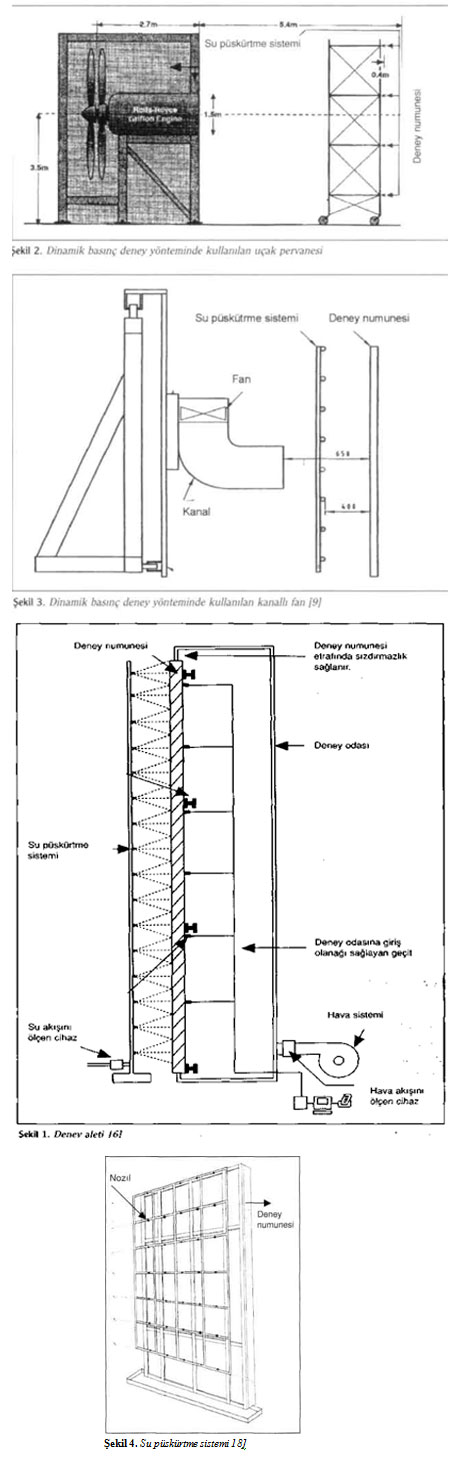 Performans değerlendirmesi için laboratuvar deney yöntemi tanımlayan standartlar, rüzgarla itilen yağmurun dış duvarda meydana getirdiği etkilerin simule edildiği deney yöntemini tanımlar. Deney yöntemi, rüzgarın duvara çarpması sonucunda duvarda oluşan etkilerin simulasyonuna bağlı olarak üniform statik basınç, devirli statik basınç ve dinamik basınç olmak üzere üç deney yöntemine ayrılır. Yöntemler, deney parametreleri, deney protokolü, deney numunesi ve deney aleti bileşenlerinden oluşur. Deney sonuçlarını etkileyen en önemli bileşenlerden biri de deney aletinin fiziksel özellikleri ve bu özelliklere bağlı olarak oluşturulan deney şartlarıdır. Bu çalışmanın amacı, rüzgarla itilen yağmurun dış duvarda meydana getirdiği etkilerin simule edilmesinde kullanılan çeşitli deney aletlerini tanıtmaktır. İlk olarak, standartlarda verilen deney aletleri tanımlanmıştır. Daha sonra, sözkonusu standartları uygulayan uluslararası kurumların adları verilmiş, bazı kurumlarda standartlarda tanımlanan deney aletlerinden kısmen veya tümüyle farklı olarak kullanılan deney aletleri detaylı olarak ele alınmıştır. Standartlarda tanımlanan deney yöntemlerine bağlı olarak deney aletlerinin çeşitliliği ve standartlarda tanımlanan deney aletlerinden farklı fiziksel özelliklere sahip deney aletlerinin de mevcut olması nedeniyle dünyada performans değerlendirmesinde çok çeşitli aletlerinin kullanıldığı belirlenmiştir. 1. GİRİŞ Bina dış duvar sisteminde hasara neden olan en önemli etmenlerden biri rüzgarla itilen yağmurdur. Dış duvar sisteminde oluşabilecek yağmur suyu kaynaklı hasarların önlenebilmesi için, yağmur etkisinde sistemin su geçirimlilik performansının, yapım sürecinden önce, laboratuvarda deneysel olarak değerlendirilmesi gerekir. Şahal [1], rüzgarla itilen yağmur etkisinde dış duvar sisteminin gerçek hizmet şartlarını tanımlamış ve gerçek hizmet şartlarını simule eden laboratuvar deney yönteminin nasıl olması gerektiğini tarif etmiştir. Bir deney yönteminin açık alanda rüzgarla itilen yağmurun durumunu veya rüzgarla itilen yağmurun dış duvara çarptığında duvarda meydana gelen etkileri simule etmesi gerektiği sonucuna varmıştır. Ayrıca, rüzgarla itilen yağmur etkisinde dış duvar sisteminin su geçirimlilik performansının değerlendirilmesi için laboratuvar deney yöntemi tanımlayan standartların, rüzgarla itilen yağmurun dış duvarda meydana getirdiği etkilerin simule edildiği deney yöntemini tanımlandığı belirlemiştir. Gerçek hizmet şartlarında, rüzgarla itilen yağmurun dış duvarda meydana getirdiği etkiler şöyle açıklanabilir. Bir yağışta, yağmur damlalarının boyutu, damla boyutlarının yağış içinde dağılım yüzdeleri, damlaların son düşme hızı, rüzgar hızı, rüzgar yönü, bina cephesinin rüzgar yönüne olan açısı, bina geometrisi (yükseklik, genişlik, saçak genişliği, cephe elemanlarının tipleri) ve yağışın süresi gibi parametrelere bağlı olarak dış duvar yüzeyine farklı değerlerde yağmur şiddeti gelir. Dış kaplamanın su emme özelliğine bağlı olarak yüzeyde su tabakası oluşur ve su tabakası dış kaplamanın yüzeyinden yerçekimi kuvveti etkisiyle aşağıya doğru akar ve/veya eşzamanlı rüzgarın etkisiyle yanlara ve yukarı doğru hareket eder. Rüzgarın, bina cephesine çarpması sonucunda duvarın dış yüzeyi boyunca değişken basınç gradyanları ve duvarın iç ile dış yüzeyleri arasında basınç farkları oluşur; ayrıca basınç gradyanları ile basınç farkları zamana bağlı olarak olarak değişir. Sözkonusu etkilerin laboratuvar ortamında simule edilmesi oldukça zor bir işlemdir. Öncelikle deney parametreleri, diğer bir anlatımla, su püskürtme oranı, uygulanacak basınç tipi ve buna bağlı olarak basınç değerleri hesaplanır. Su püskürtme oranı, duvara gelen yağış şiddetini simule eder. Su püskürtme oranı için, duvarın yapılacağı iklim bölgesinde duvarın yüzeyinde 1, 5, 10 veya 30 yıl boyunca oluşabilecek en yüksek yağmur şiddeti hesaplanır. Yağmur şiddetinin hesabında yer alan değişkenler, kısa süreli (1, 5, 10, 60dk) düşey yağmur şiddeti, eşzamanlı rüzgar hızı, rüzgar yönünün duvara olan açışı, düşey yağmur şiddetinde en yüksek oranda bulunan damla boyutu, bu boyuttaki damlanın son düşme hızı ve bina geometrisidir. Üniform statik basınç deney yönteminde, duvarın dış ve iç yüzeyleri arasındaki basınç farkı; devirli statik basınç deney yönteminde duvarın dış ve iç yüzeyleri arasındaki basınç farkı ile basınç farkının zamansal değişimi ve dinamik basınç deney yönteminde ise rüzgarın tüm etkileri, diğer bir anlatımla basınç farkı, basınç gradyanı ve bunların zamansal değişimi ile suyun tüm yönlere doğru hareketi simule edilmeye çalışılır. Binanın cephesine 1, 5, 10 veya 30 yıl içerisinde ğelebilecek yağışla eşzamanlı en yüksek rüzgar hızı tespit edilip, duvarda neden olduğu basınç değeri hesaplanır. Söz konusu hesap, üniform statik basınç deney yöntemi için geçerlidir. Devirli statik ve dinamik basınç deney yöntemleri için de basınç değeri ve frekansı hesaplama yöntemleri vardır. Deney numunesi, en az bir kat yüksekliğinde dış duvar sistemidir. Deney protokolünde ise, ilk olarak, hesaplanan oranda su duvar yüzeyine püskürtülür. Belirli bir süre sonra, su püskürtme işlemi devam ederken belirlenen basınç değeri ve tipi duvar numunesine uygulanır. Sözkonusu simülasyon yönteminde en önemli bileşen ise deney aletidir. Bu çalışmanın amacı, rüzgarla itilen yağmurun dış duvarda meydana getirdiği etkilerin simule edilmesinde kullanılan çeşitli deney aletlerini tanıtmaktır. İlk olarak, standartlarda verilen deney aletleri tan